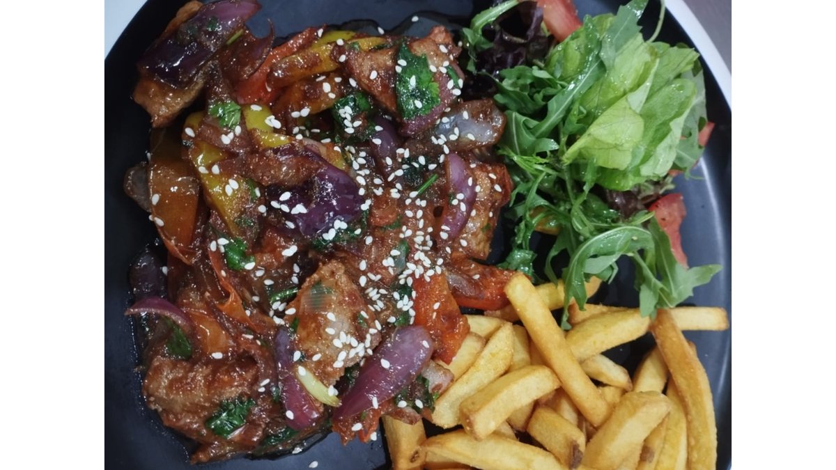 Перзола, обжаренная с овощами, с добавлением острого соуса, гарнир заказывается отдельно