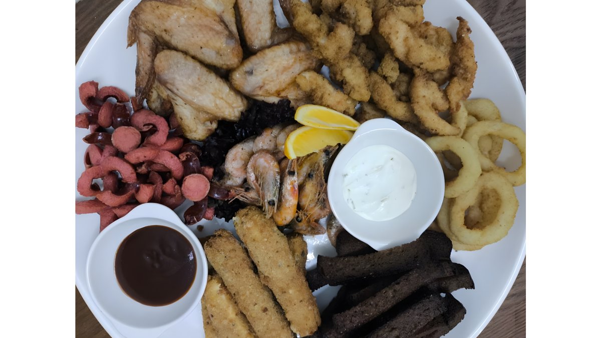 В состав сета входят: охотничьи сосиски, луковые кольца, гарлики, куриные крылышки, куриные стрипсы, креветки, сырные бруски, соус bbq, соус тар-тар