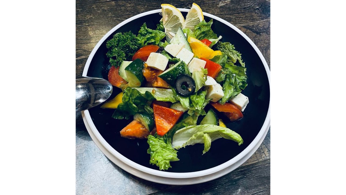Помидоры, огурцы, маслины, лимон, фетакса, болгарский перец, зелень специи