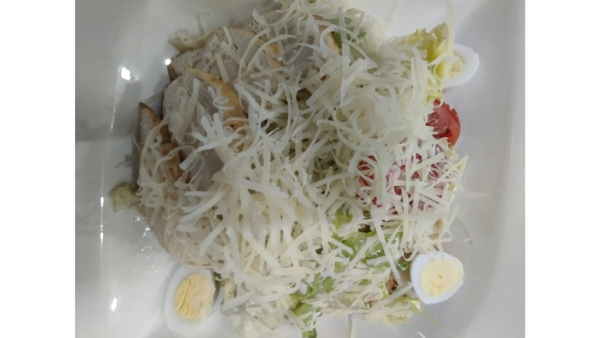 Куриное филе, крутоны, соус цезарь, айсберг, перепелиные яйца, пармезан
