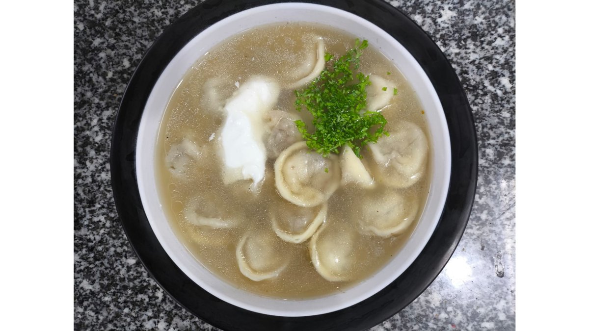 Фарш говядина, тесто, подается с бульоном и сметаной, зелень, специи