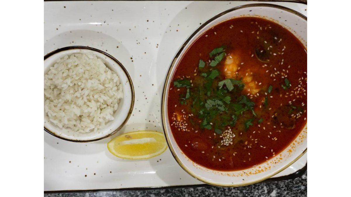 Мидии, креветки, семга, паста том-ям, кокосовое молоко, соевый соус, шампиньоны, рис, зелень, лимон