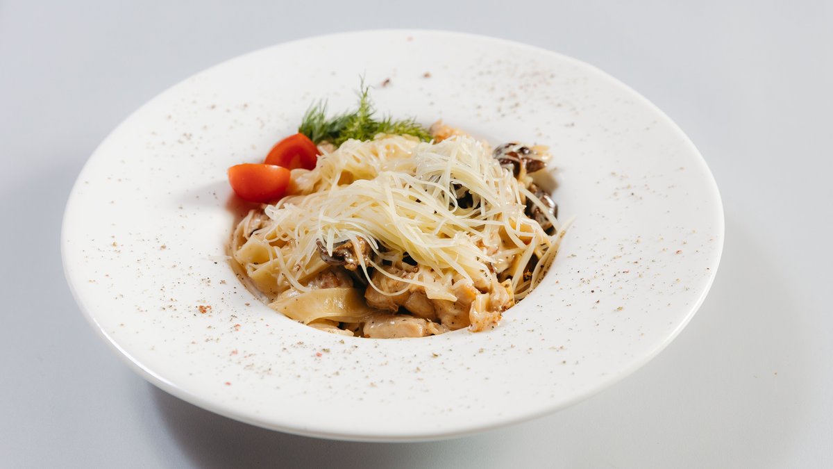 Тесто для пиццы, моцарелла, шампиньоны, куриное филе, охотничьи колбаски, томат, белый соус, соус пилати