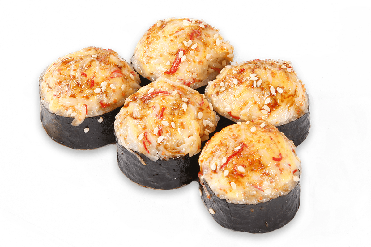 Запечённый ролл с крабовыми палочками,сливочным сыром,огурцом и майонезом