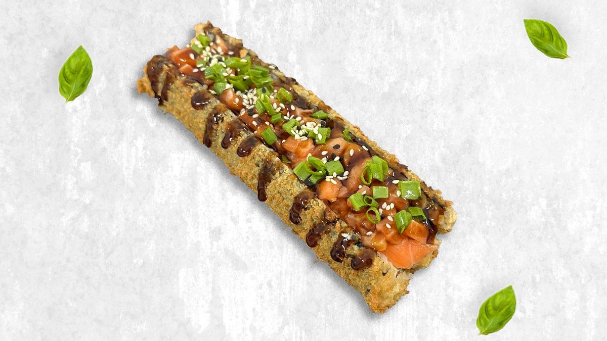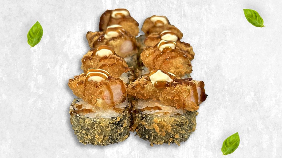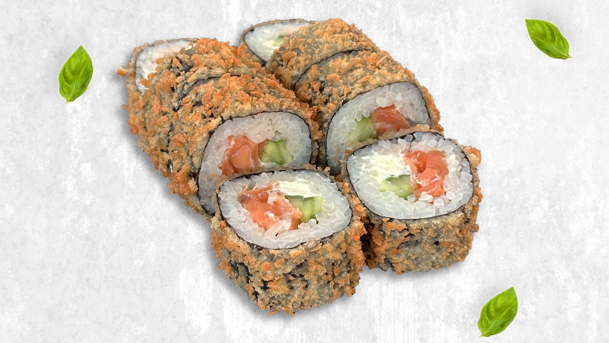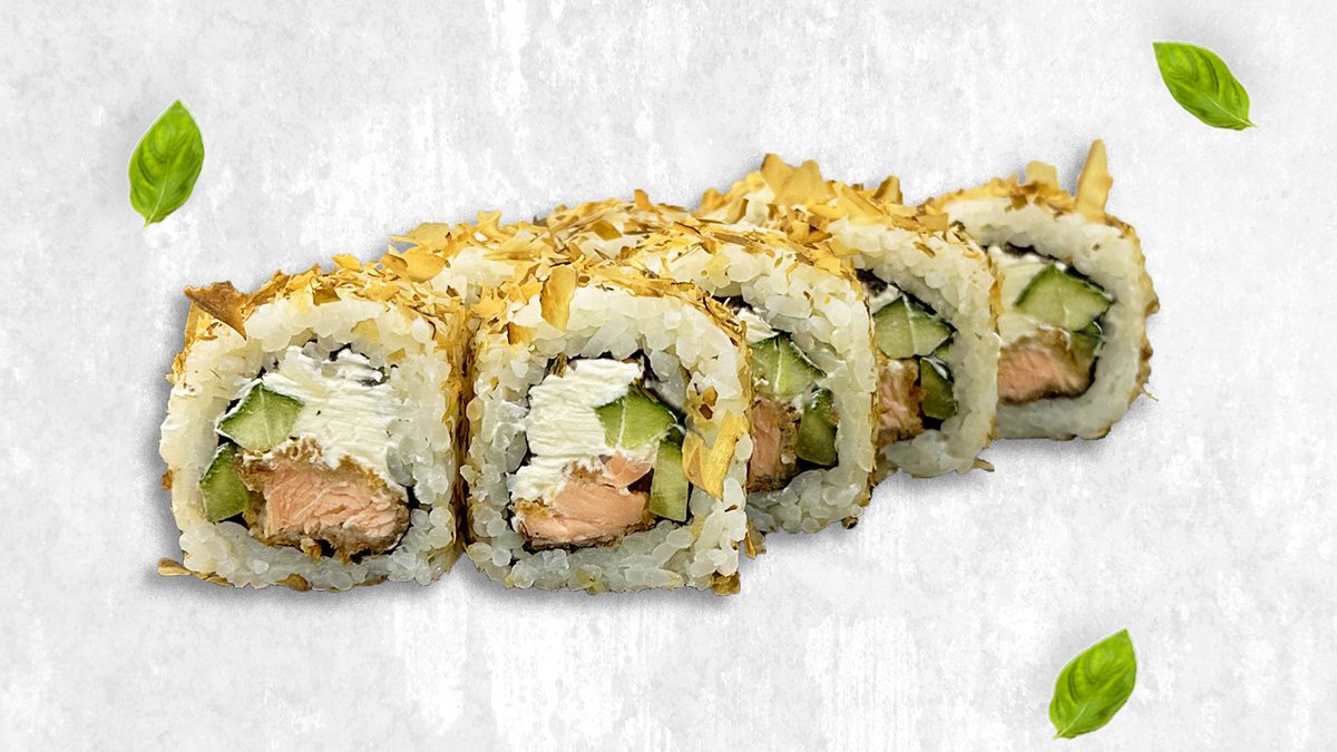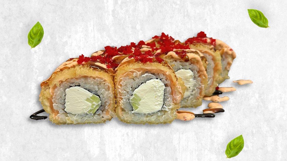 Жареный ролл, лосось, творожный сыр, огурец, спайси, унаги, тобико