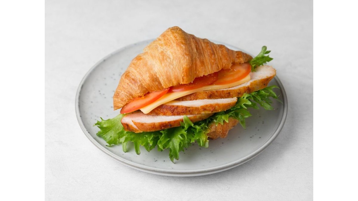 Круассан, куриная грудка, креметте, помидоры