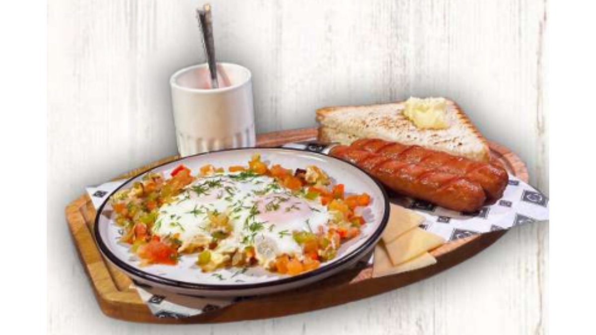 Шакшука с овощами, сосиски жареные, тост, ломтики сыра, йогурт