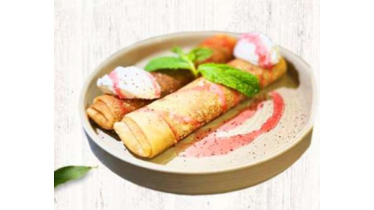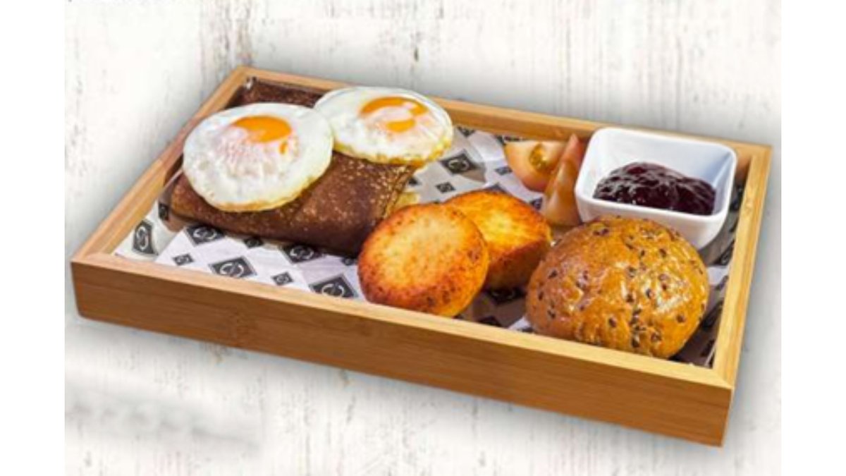 Блинчики с ветчиной, глазунья, сырники, помидоры, ржаная булочка, джем