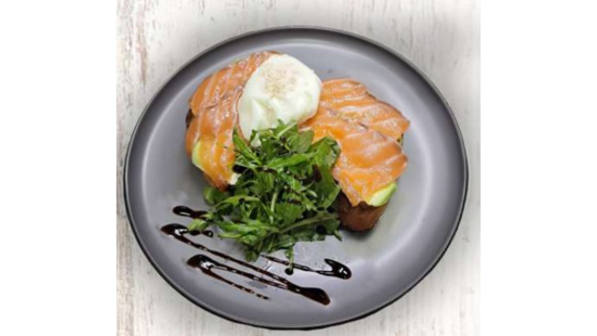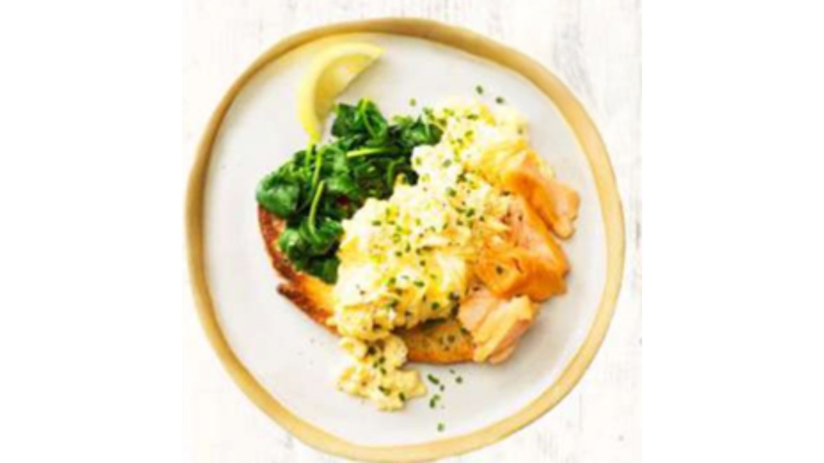 Яйца скрембл, малосольная семга, чиабатта, припущенный шпинат