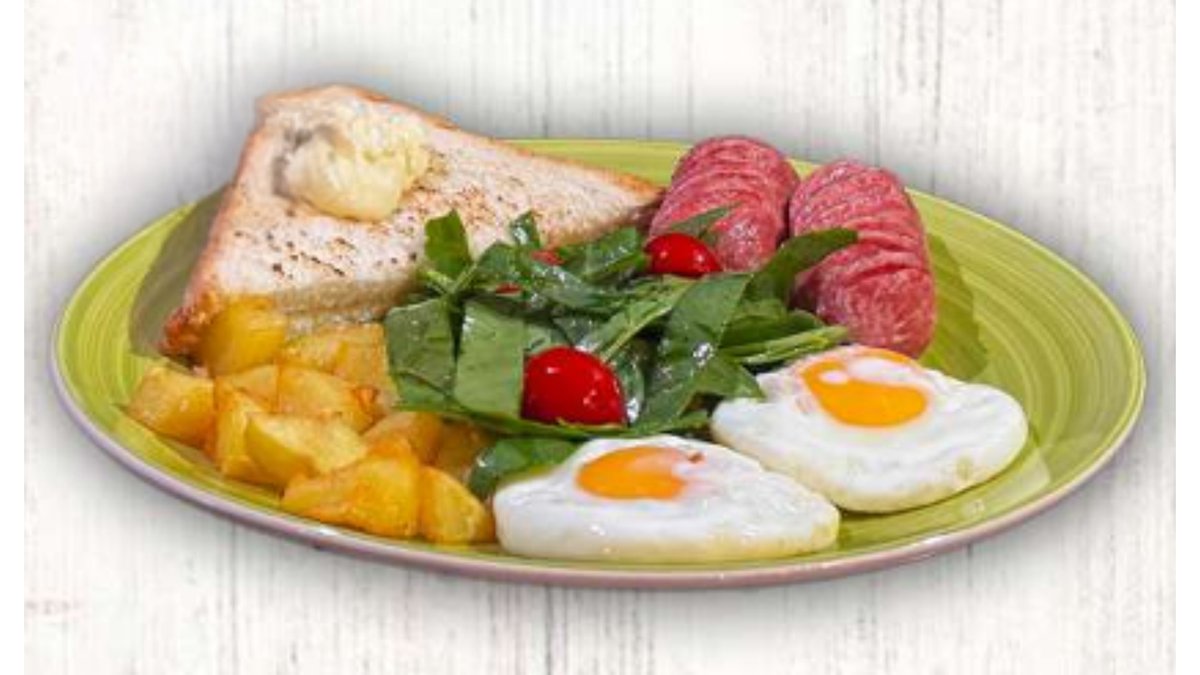 Глазунья, сардельки, картошка по-деревенски, тост, шпинат, черри