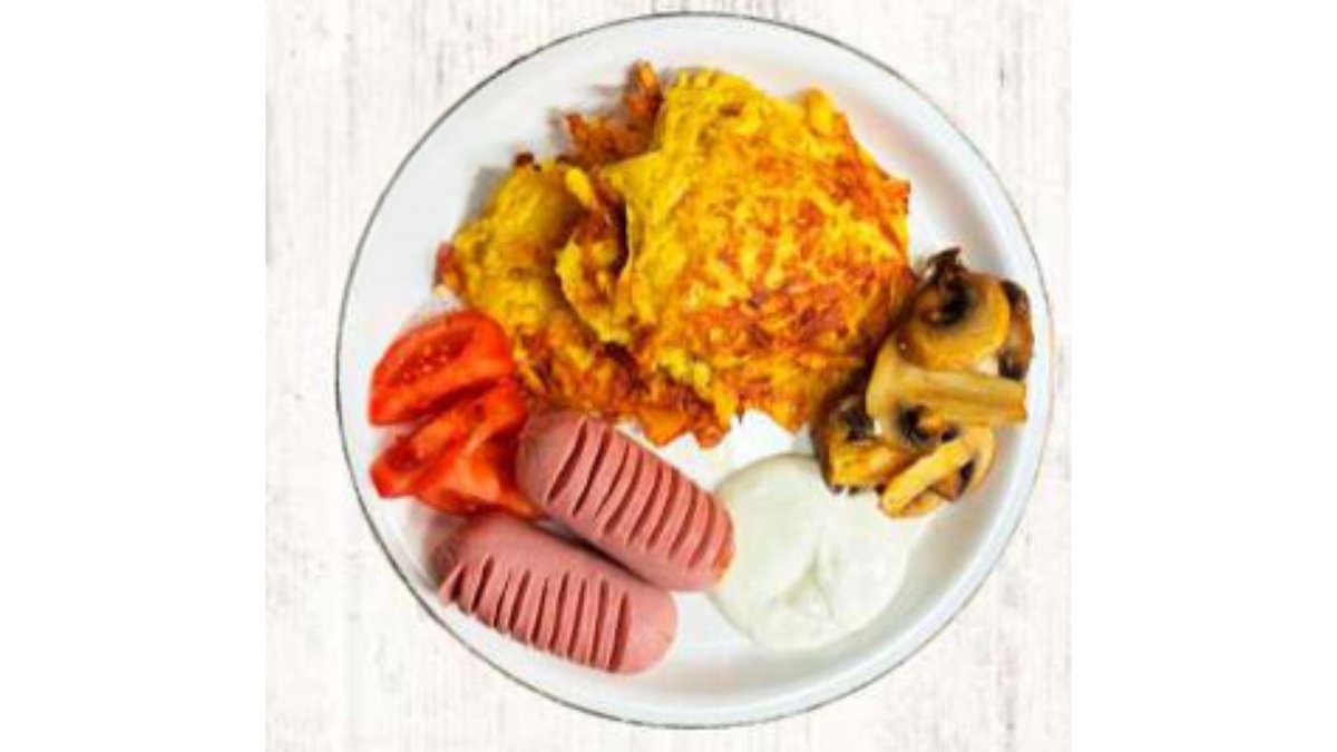 Сардельки, кабачковые оладьи, помидоры, шампиньоны
