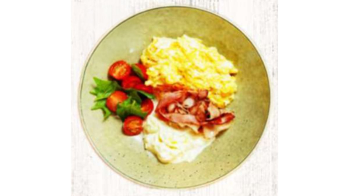 Яйца скрембл, бекон, томаты, рикотта, фитнес булочка