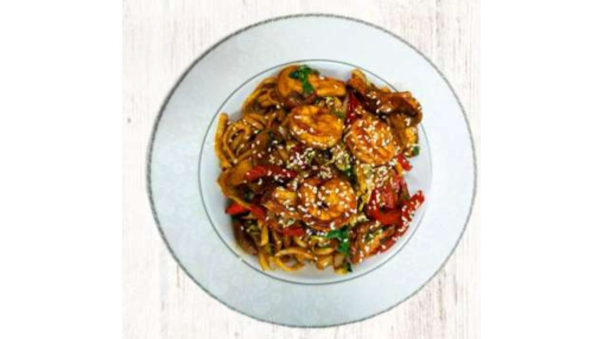 Лапша с обжаренными овощами и грибами в кисло-сладком соусе