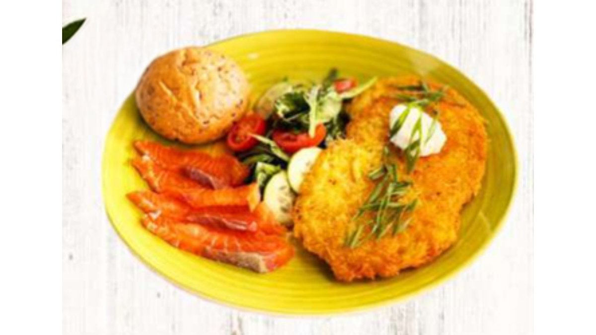 Картофельные драники, малосольная семга, булочка, овощной салат, сыр
