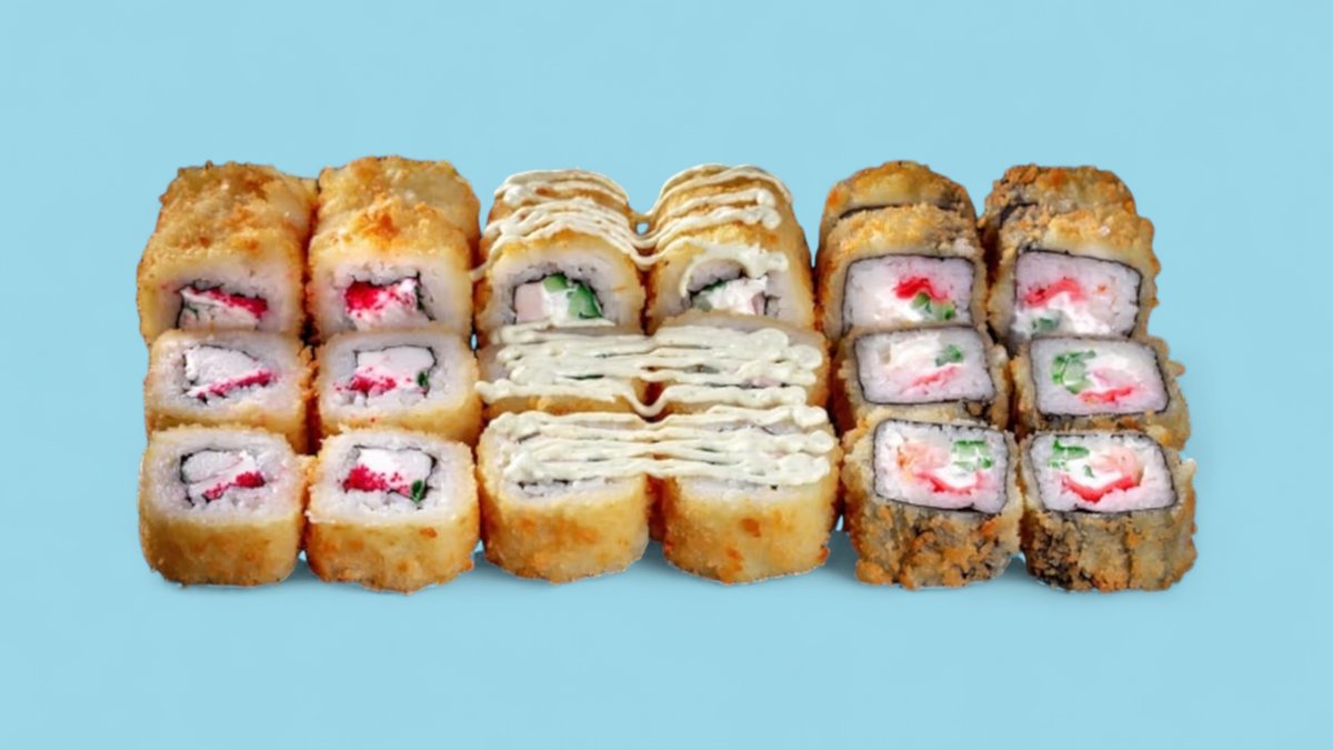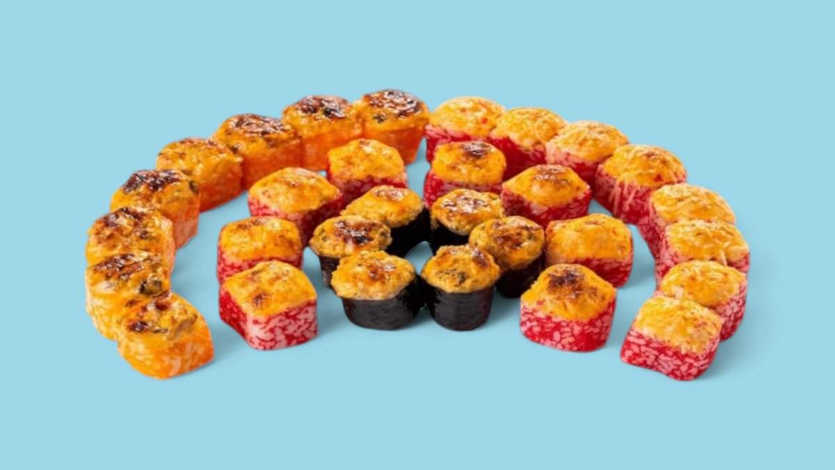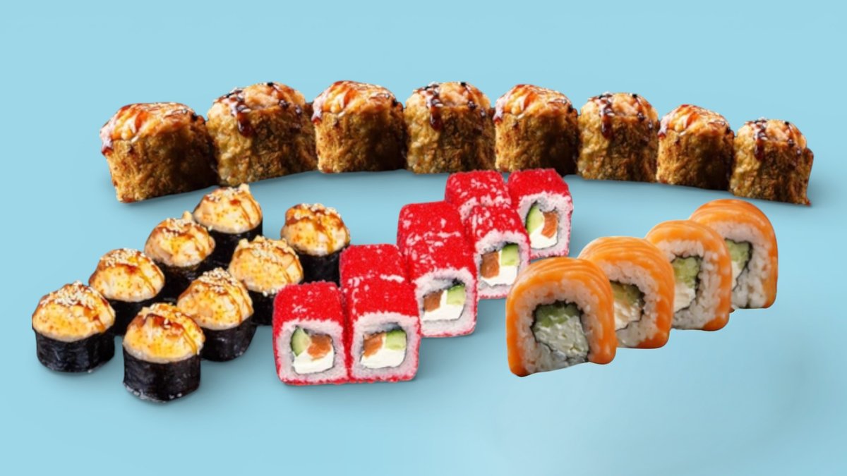 Ролл Филадельфия 8 шт., ролл Калифорния с крабом 8 шт., ролл Сырный цыпленок 8 шт., ролл Темпура с крабом 8 шт., запеченный ролл с крабом 8 шт.