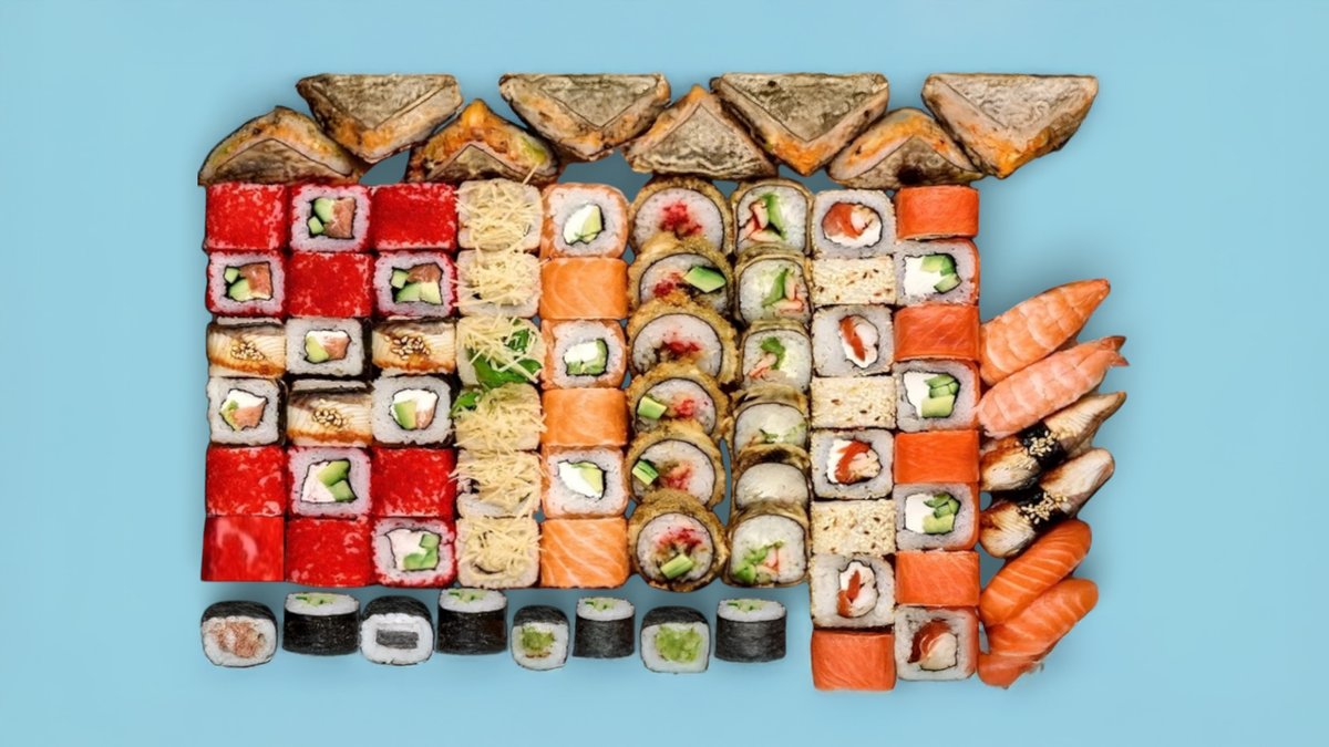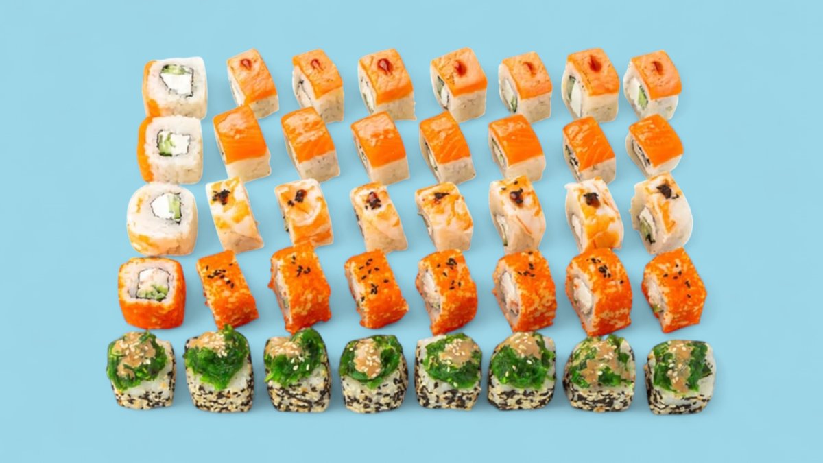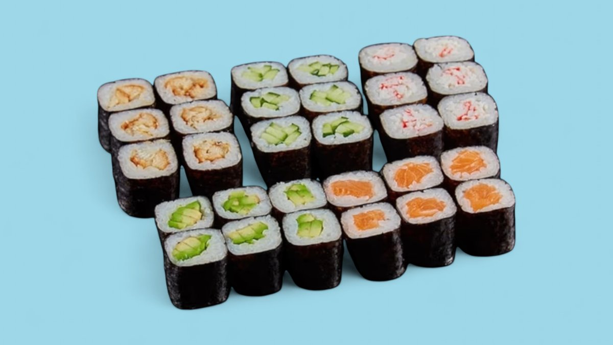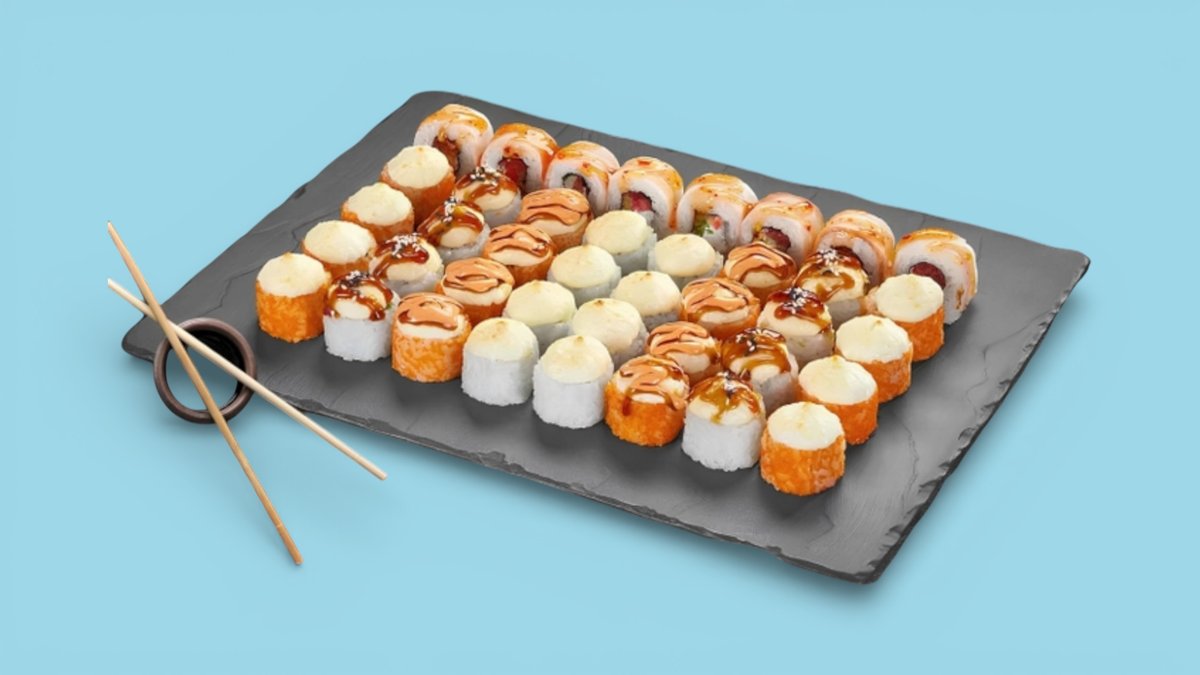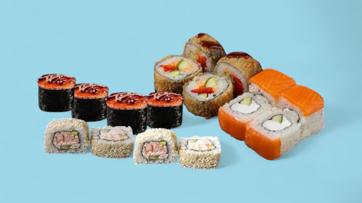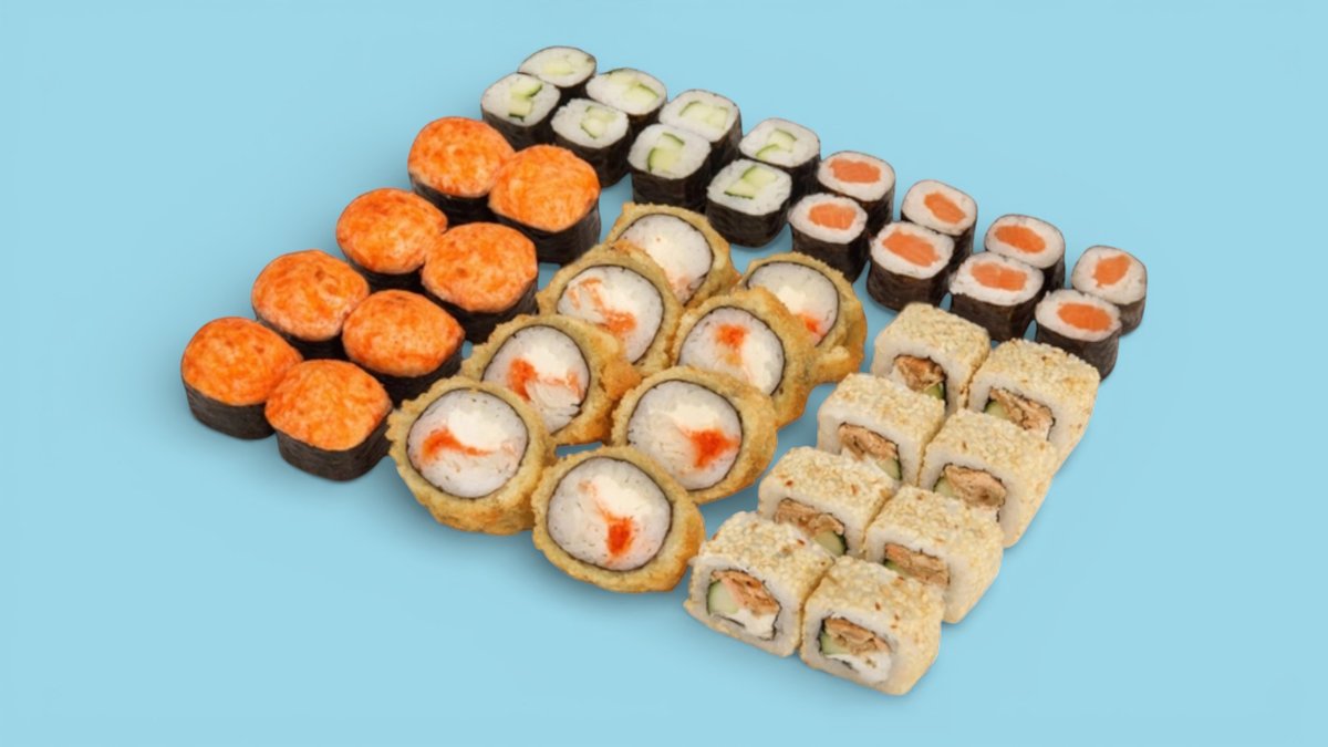 72шт Суши-сэндвич 8 шт., ролл Калифорния с лососем 6 шт., ролл Филадельфия с угрем 6 шт., ролл Филадельфия light 8 шт., ролл Калифорния с кунжутом 8 шт., ролл Филадельфия гранд 6 шт, ролл Темпура с лососем 6 шт., ролл Темпура с крабом 6 шт., ролл сырный 6 шт., мини-ролл с огурцом 8 шт., суши с лососем. 72 шт.