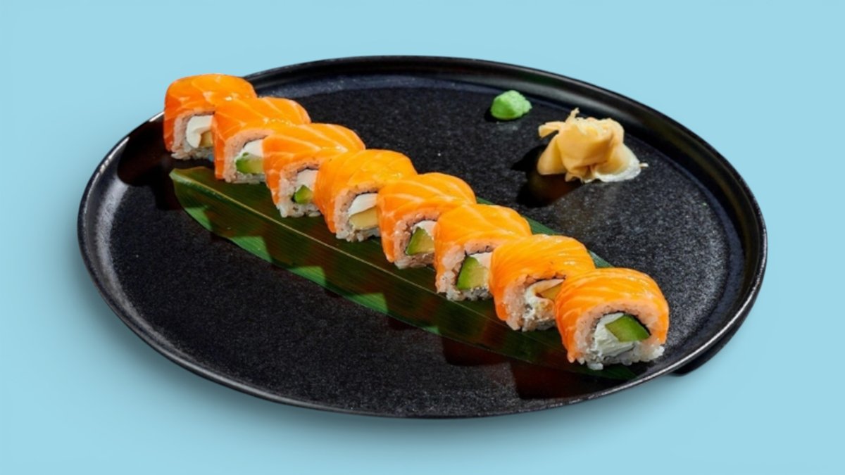 54шт Ролл Филадельфия, ролл Темпура с лососем, ролл Калифорния с крабом, ролл Аяши, мини-ролл с творожным лососем, мини-ролл с огурцом. 54 шт.