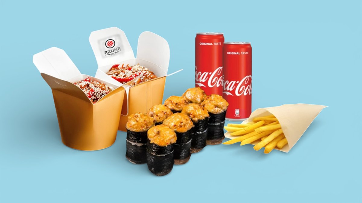 300гр Удон с курицей 2 шт., запеченный мини-ролл Chicken cheese 9 шт., картофель фри 1 шт., Coca-Cola 250 мл 2 шт. На 2 персоны