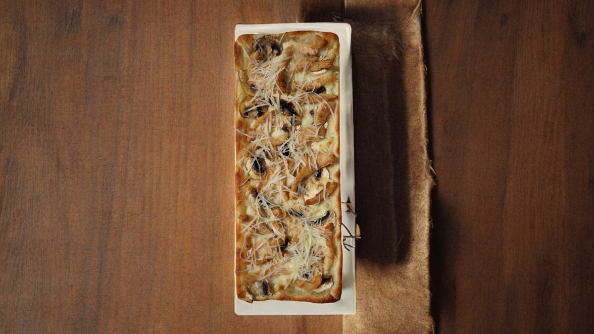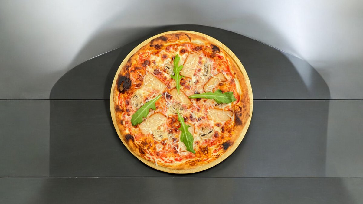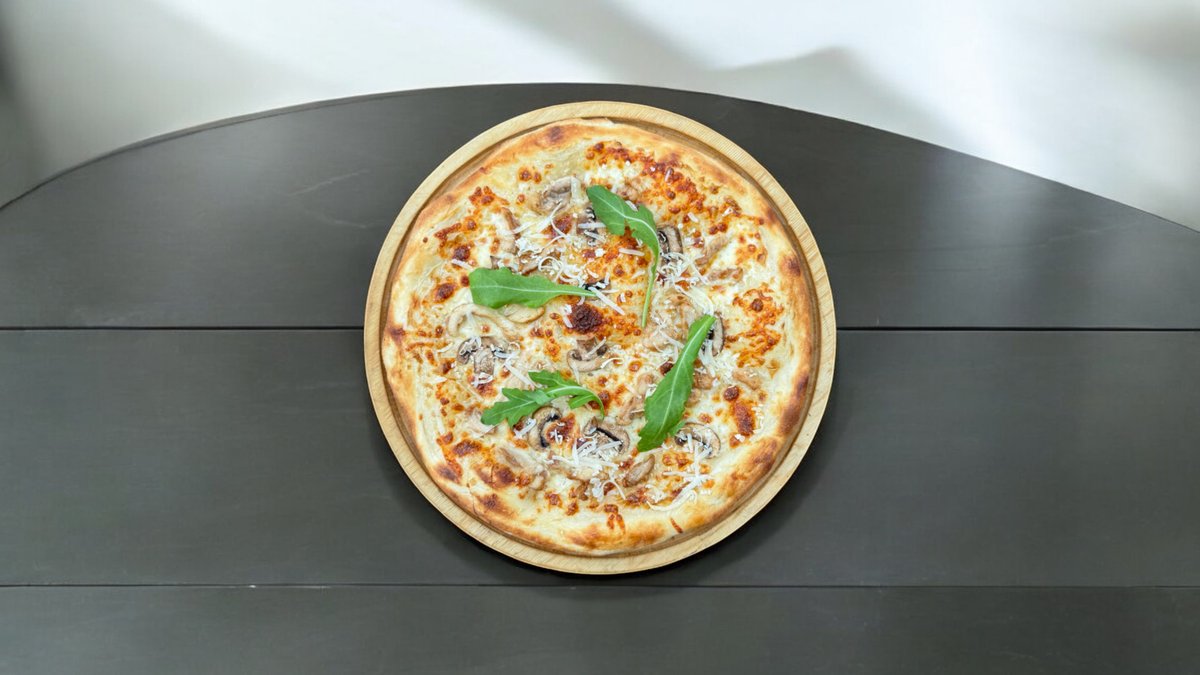 300гр, 25 см, Сыр пармезан, сыр моцарелла, шампиньони, оливковое масло, куриное филе