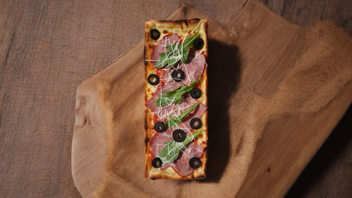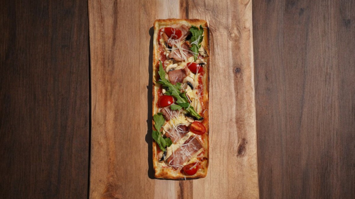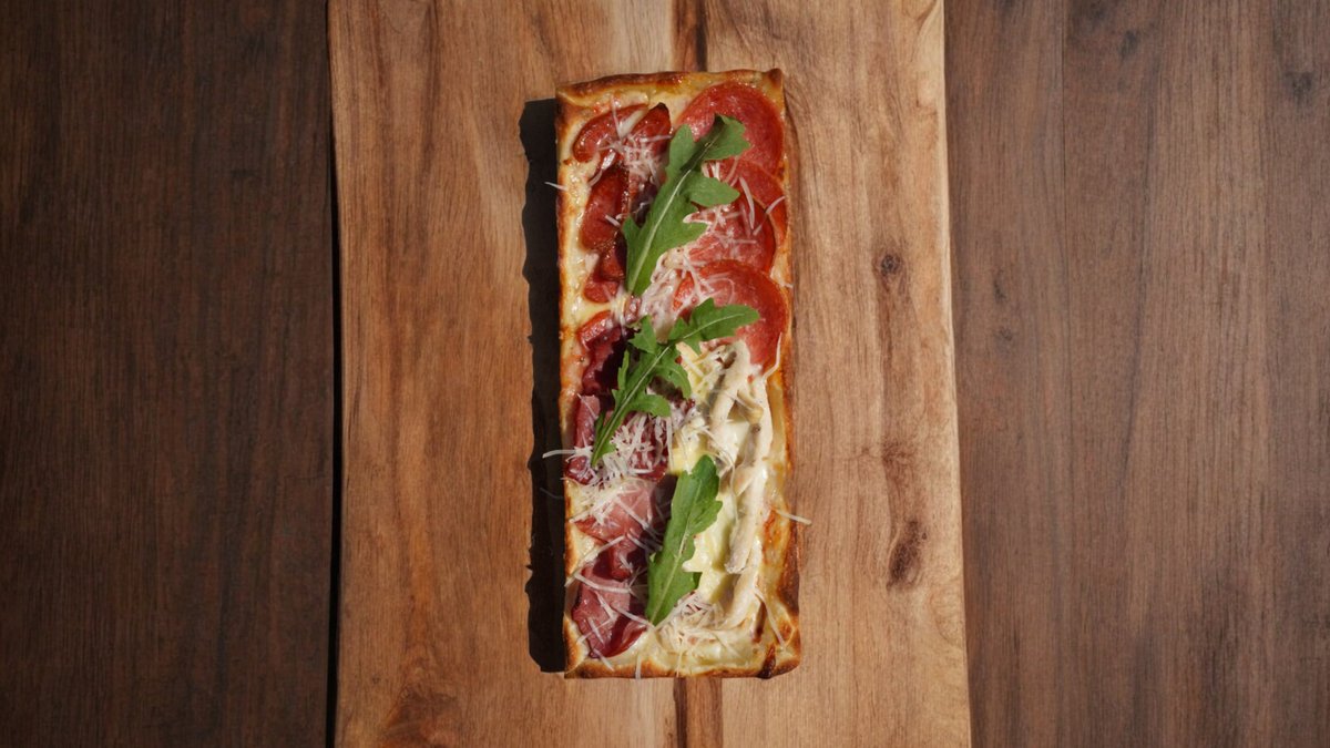 340гр, 25 см, Сыр моцарелла, сыр пармезан, соус пелати, копченое мясо, оливковое масло, руккола
