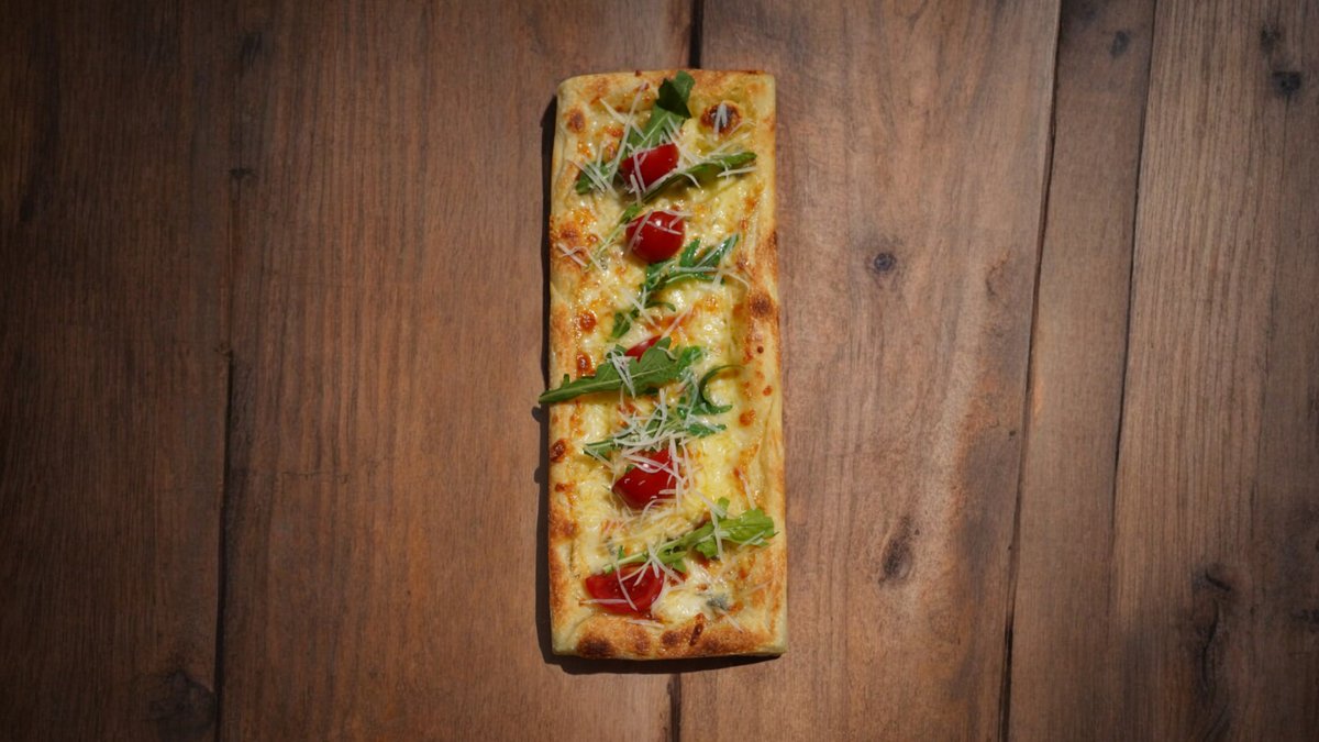 270гр, 25 см, Сыр пармезан, сыр моцарелла, сыр гауда, сыр горгонзола, помидор черри, оливковое масло, руккола