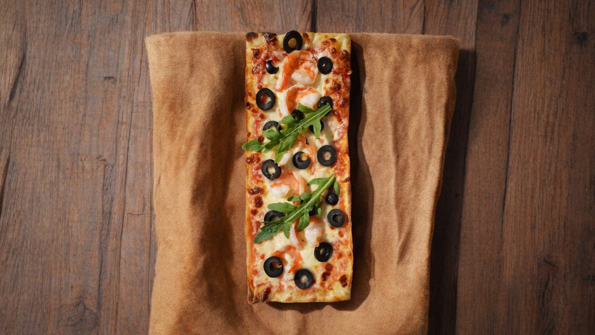 350гр, 25 см, Сыр моцарелла, креветки, соус пелати, оливки, руккола