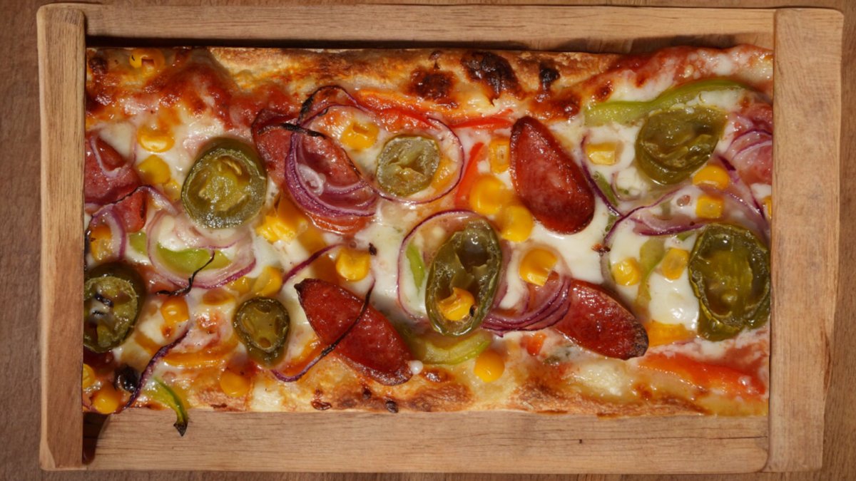 380гр, 25 см, Сыр моцарелла, соус пелати, халапено, охотничьи колбаски, красный лук