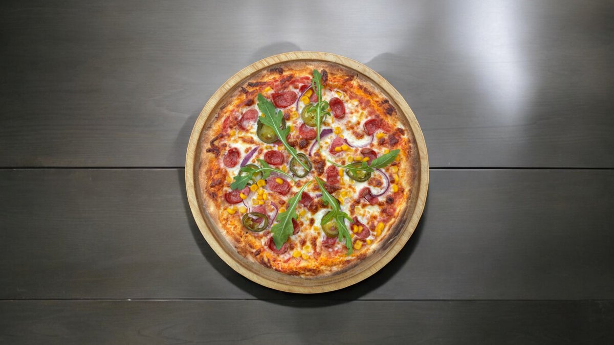 350гр, 25 см, Сыр моцарелла, соус пелати, оливковое масло, пепперони, красный лук, перец калифорния, кукуруза, руккола