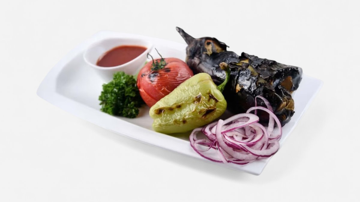 Запеченные на углях баклажаны, болгарский перец и помидоры, приправленные растительным маслом, чесночком и зеленью