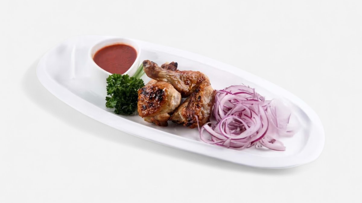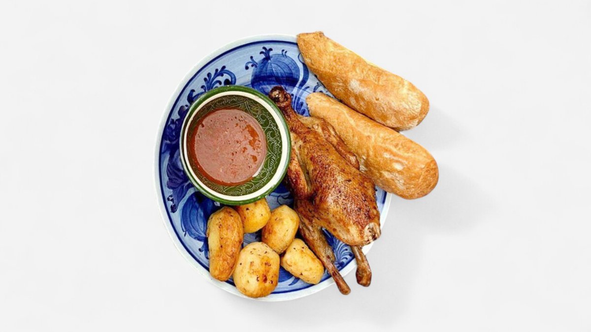 Цыплёнок табака с молодым картофелем, обжаренным в сливочном масле, салатом майса, томатным соусом и хлебом от нашего партнёра тhe non