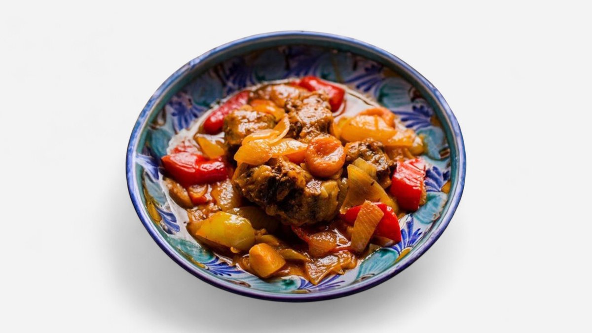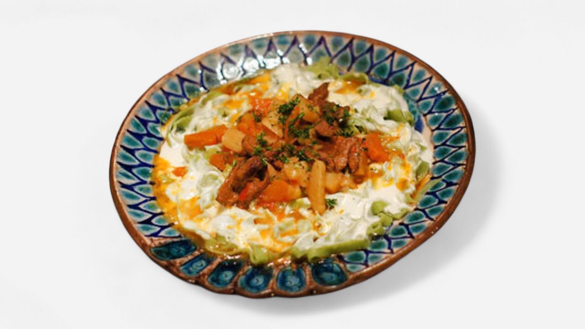 Баранина, тушёная с болгарским перцем, морковью и картофелем, подаётся на тоненьком отварном тесте