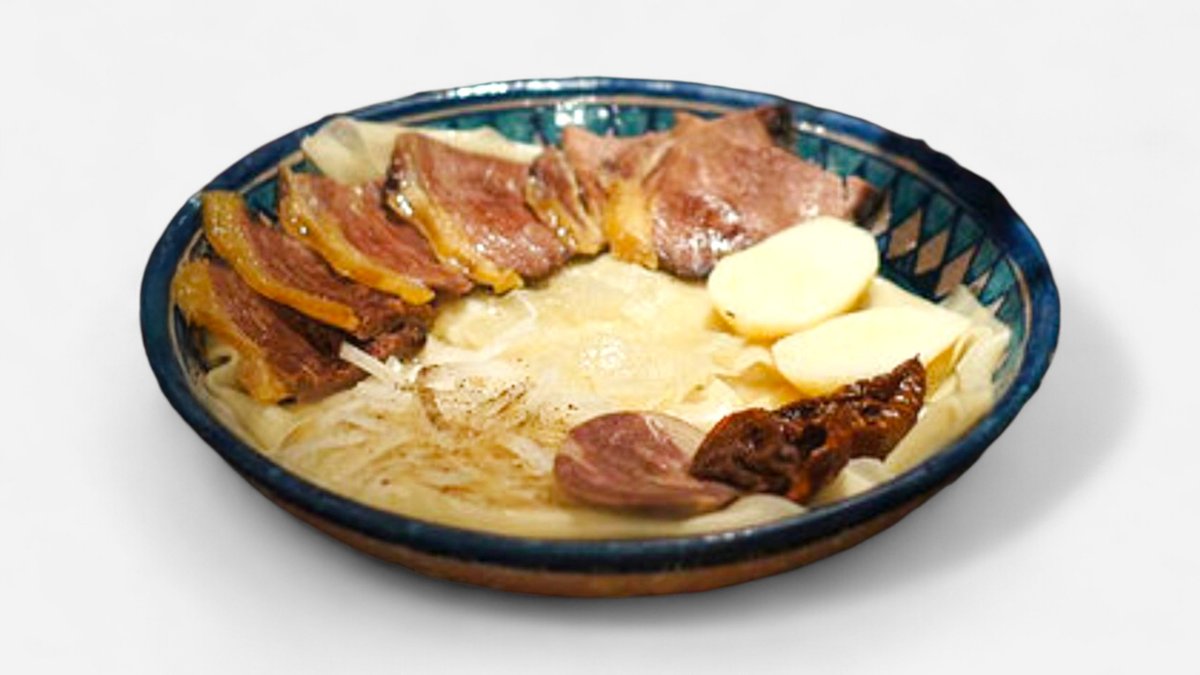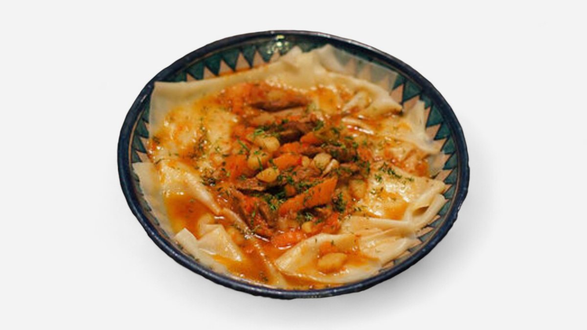 Старинное узбекское блюдо: вручную сделанная домашняя лапша с мелко нарезанной отварной кониной. Мясо отваривается с добавлением специй (зира, черный молотый перец) 2-3 часа и мелко нарезается. Тесто варится на бульене, где отваривалось мясо, тесто в охлажденном виде нарезается мелко. Тесто и мясо перемещивается с добавлением черного молотого перца.