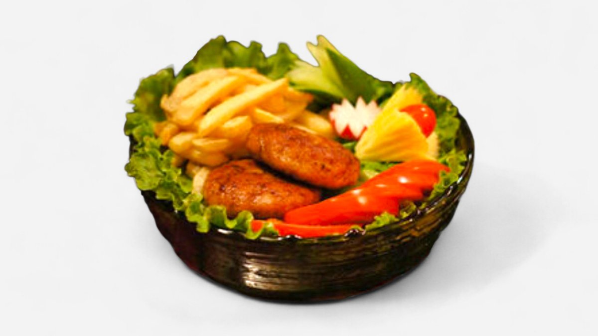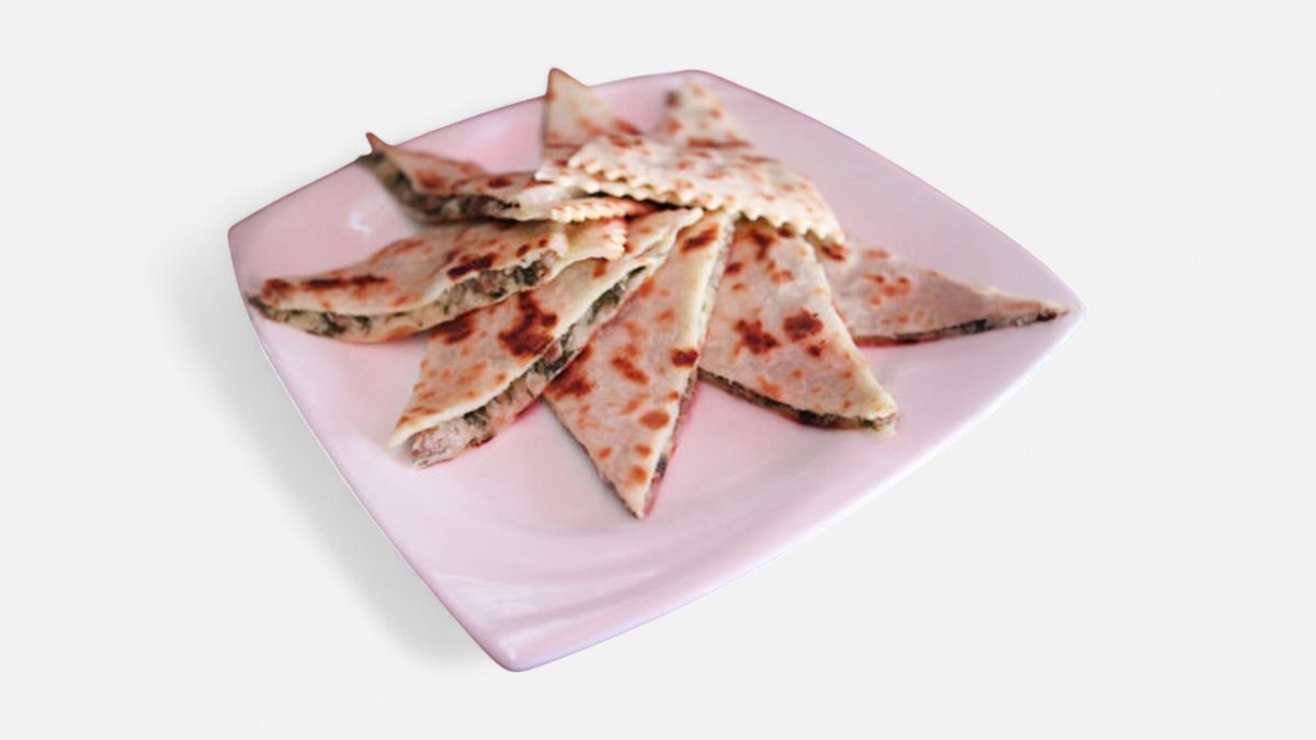 Мелко нарезанное мясо с луком, болгарским и острым перцем, завёрнутое в тесто и обжаренное на сливочном масле, 6 кусочкев. Мясо баранины.