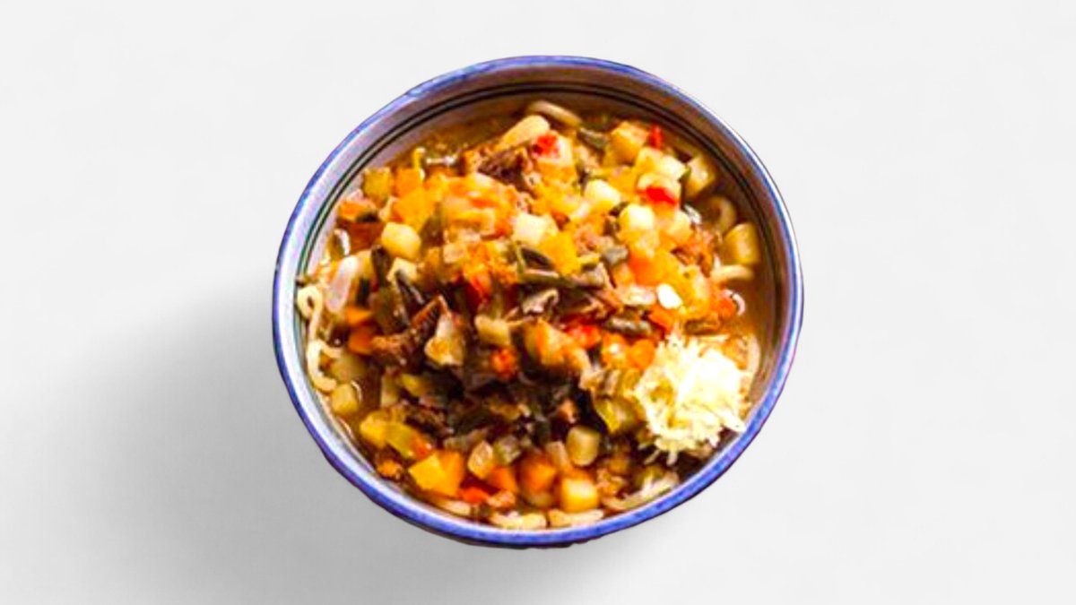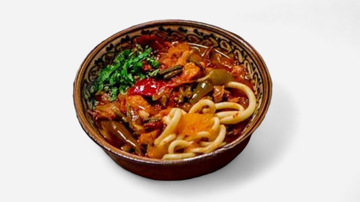 Баранина тушёная с овощами (болгарский перец, дайко, | редька, помидоры) и зеленью, подаётся с бульоном и лапшой изготовленной вручную