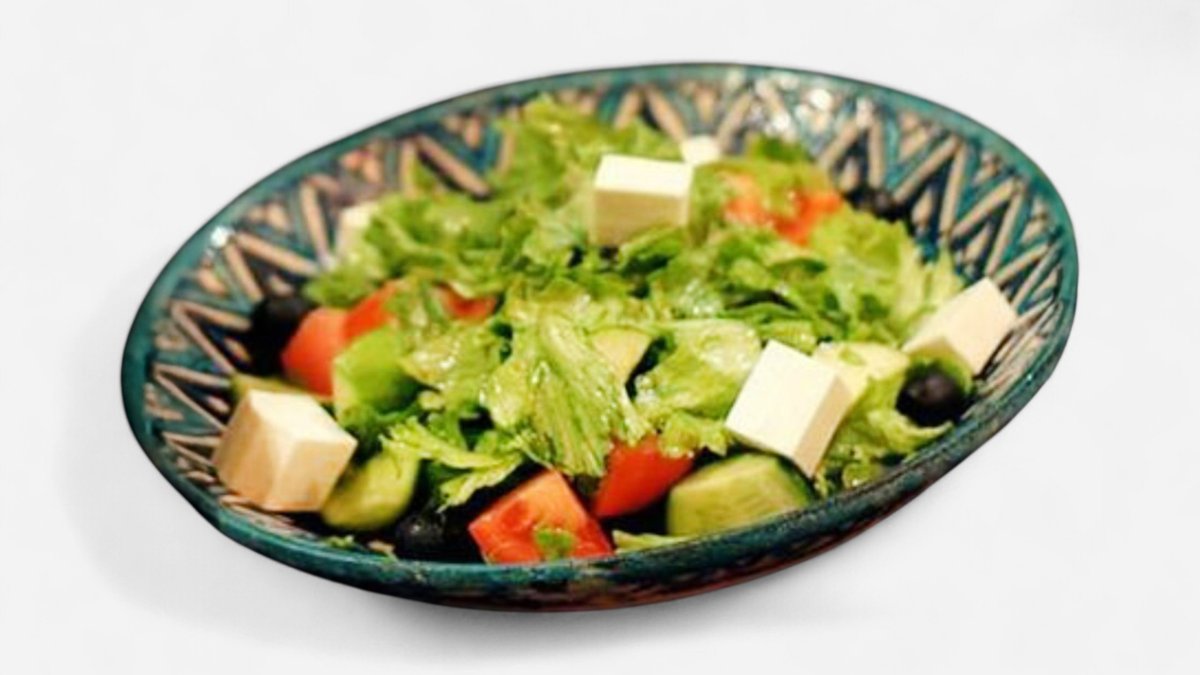 Свежие крупно-нарезанные помидоры и огурцы, настоящий сыр «фета», маслины, лук шалот, листья салата «айсберг», орегано, каперсы, заправленные оливковым маслом и винным уксусом