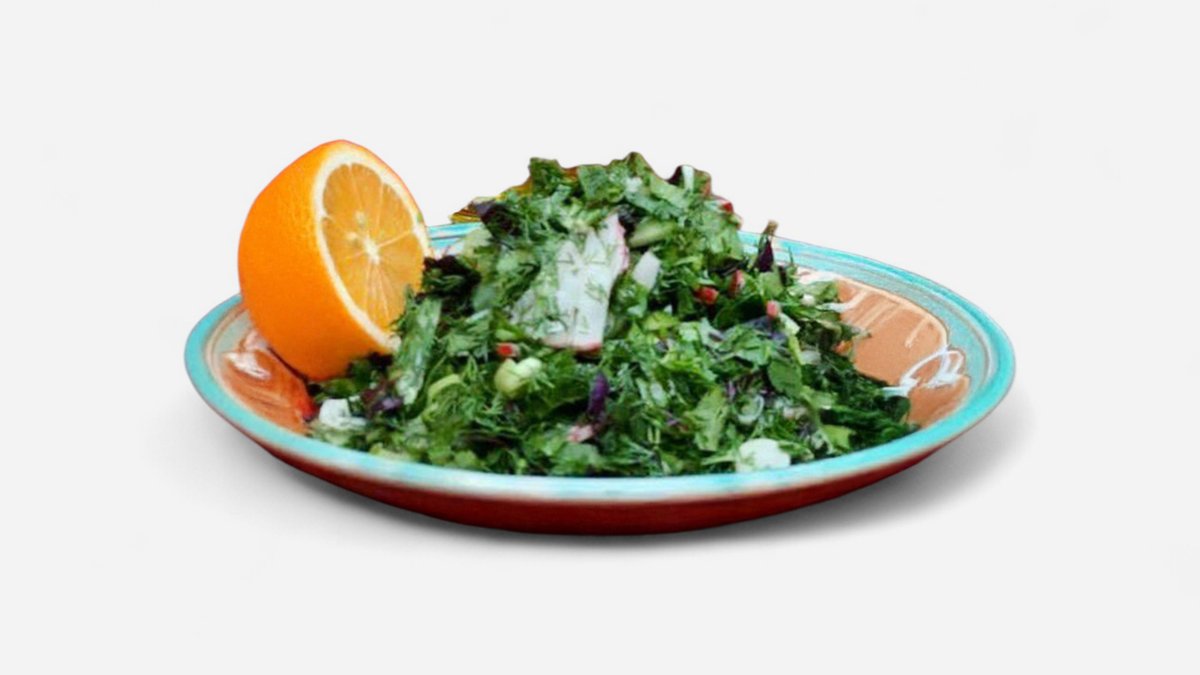 Лёгкий витаминный салат из райхона, кинзы, зелёного лука, свежих огурцов, редиски, чеснока, заправленный соком лимона и оливковым маслом