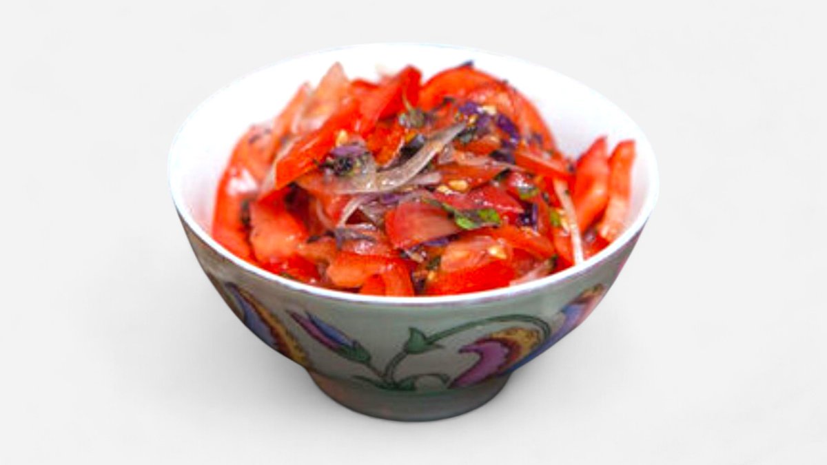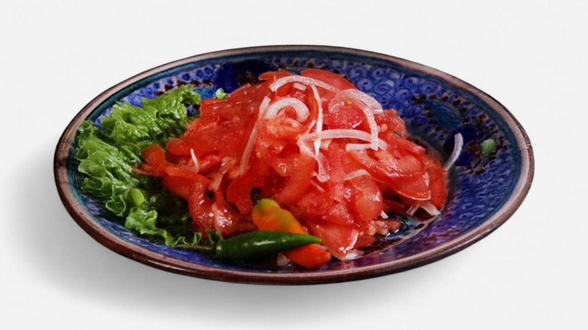 Тонко нарезанные крупные, спелые помидоры розового сорта pink paradise, белый лук и острый перец
