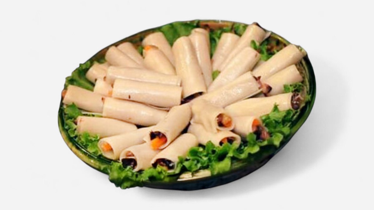 Кусочки баранины, обжаренные на гриле со свежим болгарским перцем, репчатым луком, шпинатом и сыром гауда, завёрнутые в нежное тонкое тесто, 8 кусков