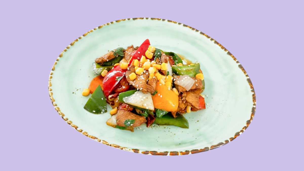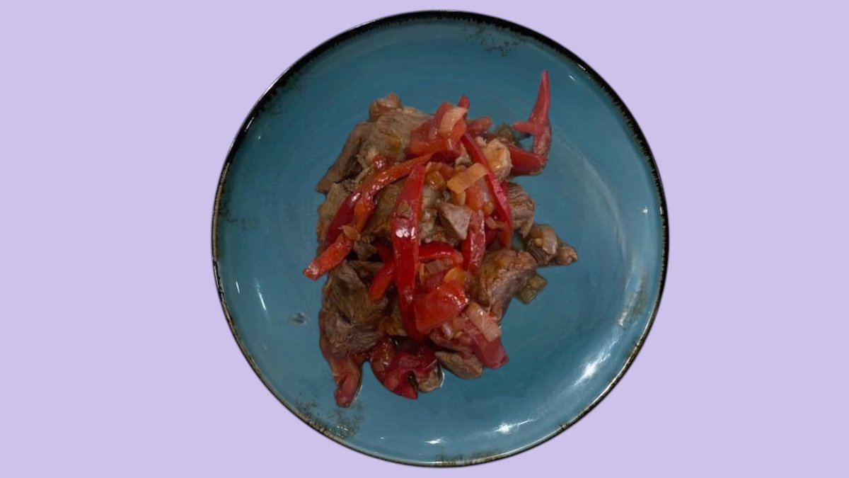 200гр Говядина, болгарский перец, капуста Босай, лук репчатый, томаты, масло кунжутное, соевый соус, специи