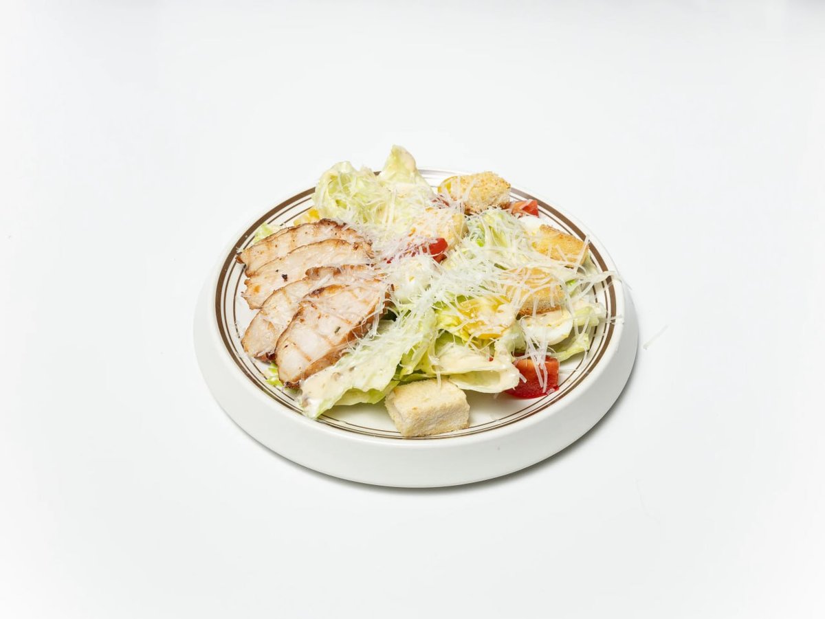айсберг, помидор черри, сухари, сыр пармезан, куриное филе, перепелиное яйцо, соус
