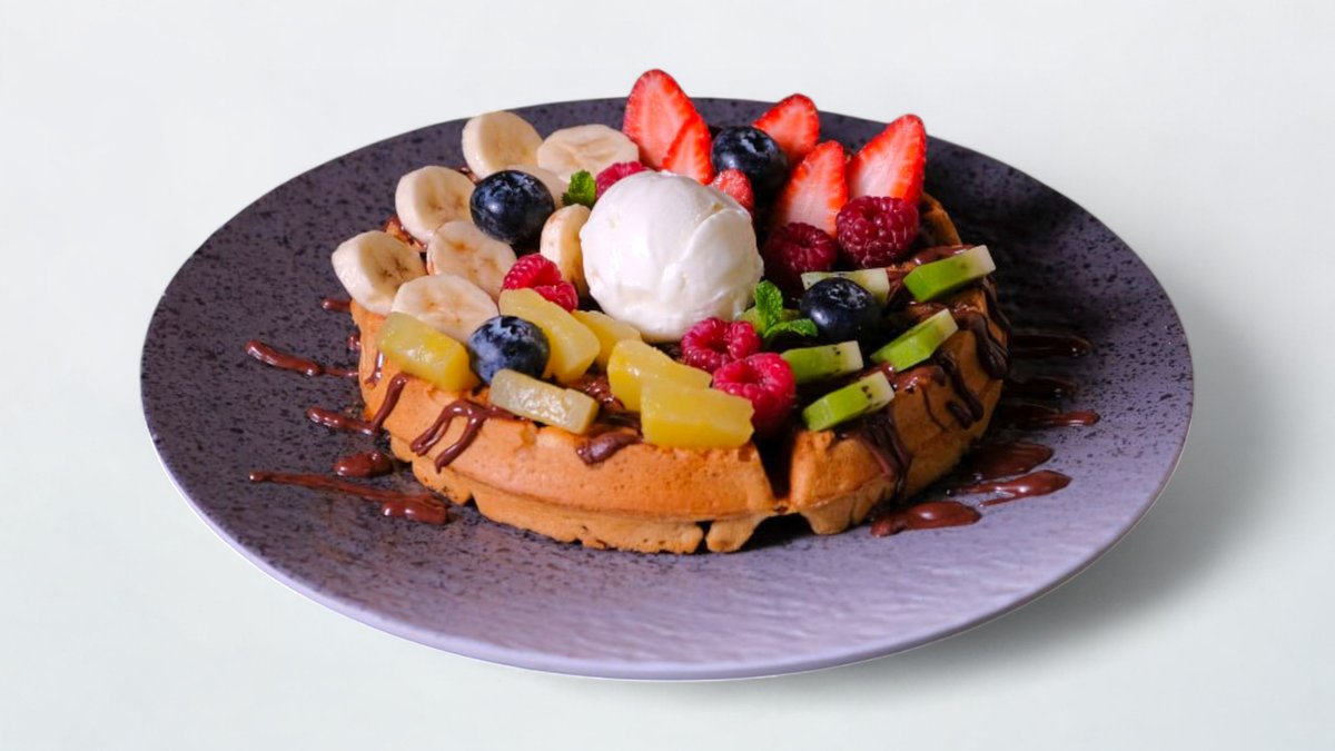 Венская вафля, шоколадная паста, банан, клубника, голубика, малина, ананас, киви, мороженое