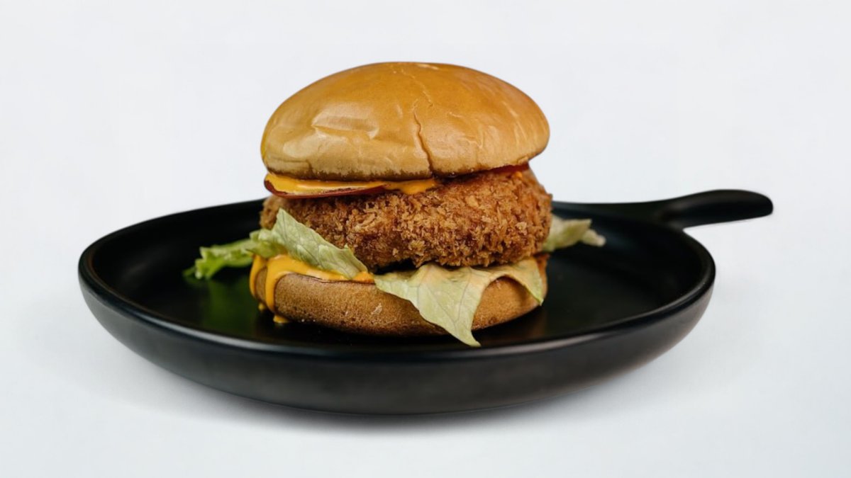 Булочка, котлета куриная, айсберг, огурчики, помидоры, секретный соус