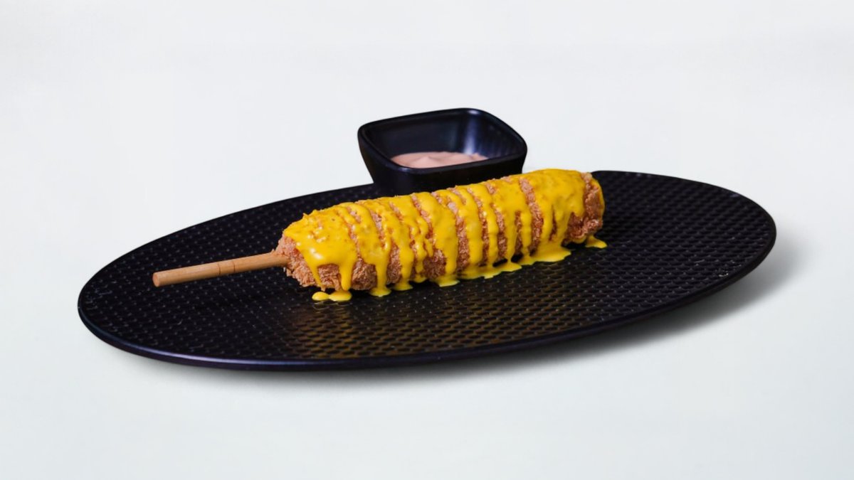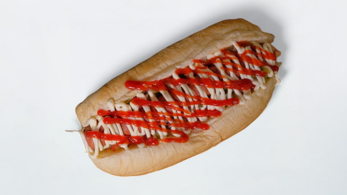 Булка, сосиска, салат под соусом ремулад, соленый огурец, кетчуп heinz, майонез