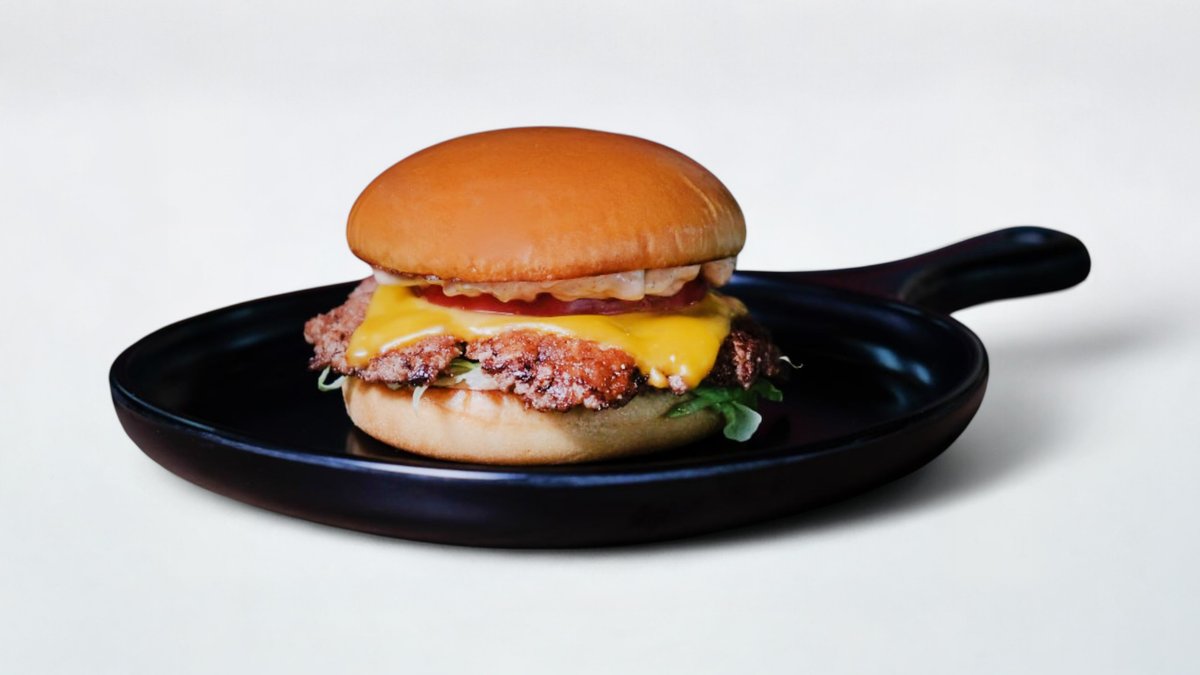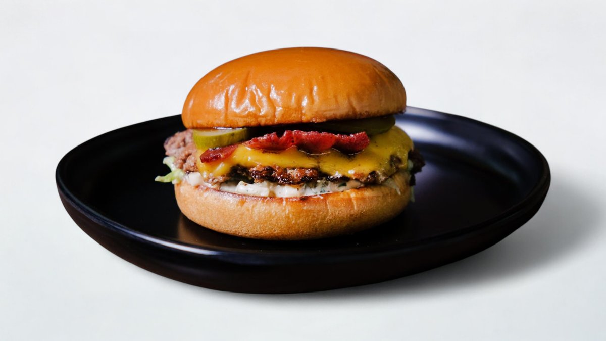 Булка глейз, фарш из мраморной говядины, сыр, айберг, лук, соус тартар, соус bbq)