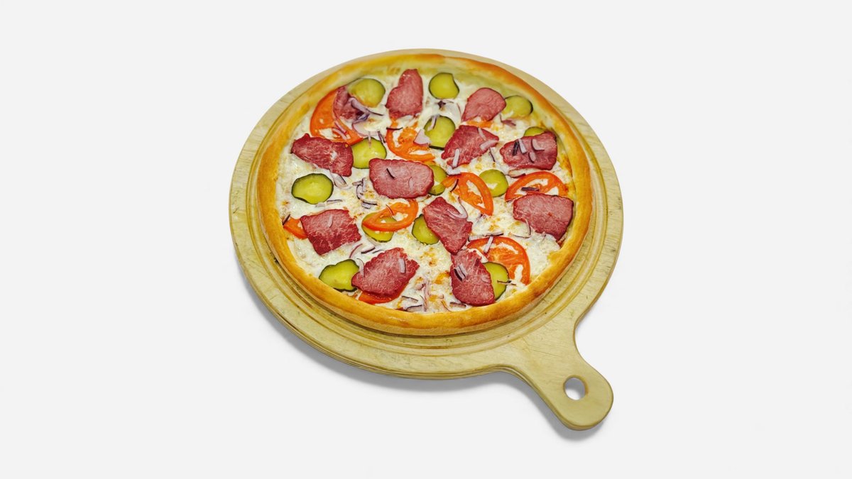 копченное мясо, колбаса пиперони, сосиска, красный лук, соленый огурец, сыр, кукуруза 30 см