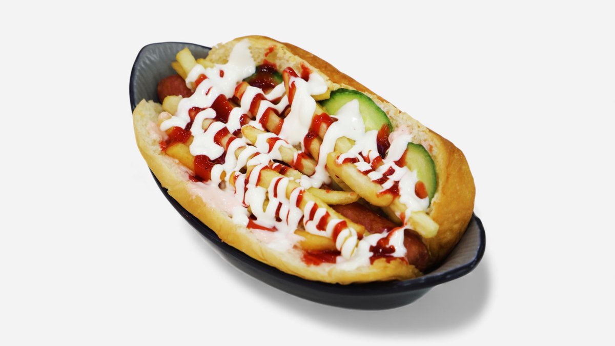 Булочка, сосиска,, айсберг, помидор, огурец, сосиска, картошка фри, соус