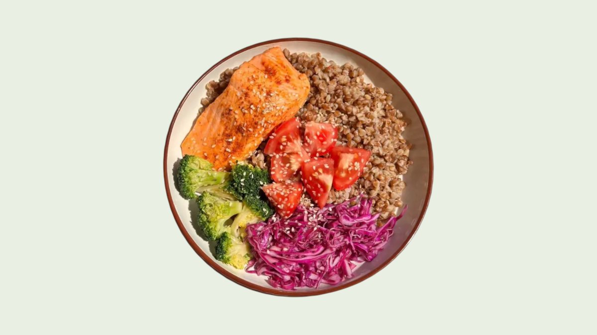 Боул с красной рыбой Это яркое и полезное блюдо, которое сочетает в себе нежный вкус форели и разнообразие овощей. Форель, богатая полезными жирами, придаёт блюду изысканный вкус, а гречка служит питательной основой. Брокколи добавляет интересную текстуру, а помидоры и красная капуста вносят свежесть. Лимонный сок подчёркивает вкус ингредиентов, а томатный соус объединяет их в гармоничное целое. Зелень и чеснок придают боулу аромат и пикантность. Этот боул не только насытит, но и порадует глаз своим аппетитным видом Белки 44г, жиры 19г, углеводы 47, калорийность 570
