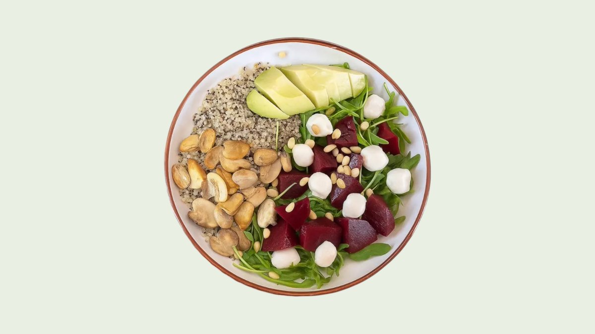 Боул с моцарелллой Это изысканное и полезное блюдо сочетает богатство вкусов и текстур. Моцарелла придаёт нежность, свёкла — сладость и яркость, авокадо — кремовость и пользу. Жареные шампиньоны добавляют аромат, руккола — пикантность, а киноа — белок и клетчатку. Кедровые орехи вносят хруст и ореховый вкус, оливковое масло объединяет всё в сбалансированный и аппетитный боул Белки 17г, жиры 27г, углеводы 79г, калорийность 632.