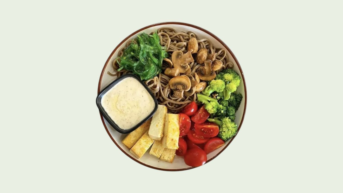 Боул с тофу и гречневой лапшой Это блюдо сочетает богатство вкусов и текстур. Гречневая лапша придаёт лёгкость и ореховый аромат, шампиньоны — насыщенный вкус, а салат чука — уникальный аромат и микроэлементы. Запечённый тофу добавляет кремовость, брокколи — витамины и хруст, помидоры — сочность. Соевый соус объединяет ингредиенты, придавая умами, а оливковое масло подчёркивает вкус. Всё вместе — сбалансированное и полезное блюдо Белки г 39, жиры 14г, углеводы 147г, калорийность 535
