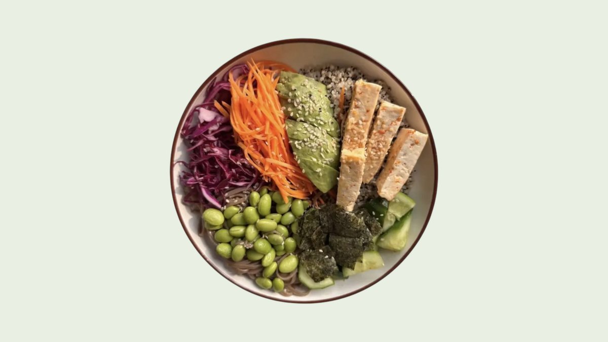Боул с эдамаме Это красочное и полезное блюдо сочетающее в себе богатство вкусов и текстур. Гречневая лапша придаёт блюду лёгкость и приятную нотку, а киноа служит источником белка и полезных микроэлементов. Эдамаме вносит свежесть и характерный вкус зелёных соевых бобов, а тофу добавляет кремовую текстуру и мягкость. Красная капуста, морковь, авокадо и огурец обогащают боул витаминами, минералами и разнообразием цветов. Соус тахини объединяет все ингредиенты, придавая им ореховый и слегка сладковатый вкус Белки 23г, жиры 15г, углевод 67г, 505 калорий